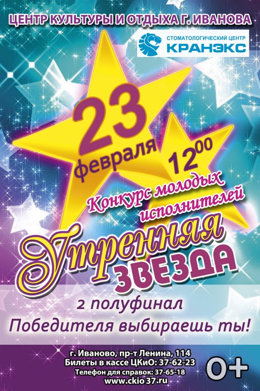 23 февраля в 12:00 на Большой сцене ЦКиО – второй полуфинал конкурса «Утренняя звезда» ![]() Вновь на сцену выйдут молодые таланты, зажгутся новые звездочки! В этом году новые правила и новая формула успеха! Победителя выбирают не только жюри, но и зрители! Так что судьба участников в ваши руках! Приходите и выбирайте лучшего, того, кто пройдет в финал проекта! Полуфиналы пройдут в формате поединков-раундов. Профессиональное жюри оценит выступление конкурсантов в баллах, а зрители проголосуют карточками. Покорять жюри и зрителей приедут молодые артисты из Кинешмы, Тейкова, Богданихи, п. Лежнева, а также участники из Иванова. Приходи на второй полуфинал конкурса «Утренняя звезда»! Отдай свой голос за лучшего! Билеты: в кассе ЦКиО, телефон: +7(4932)376223 |