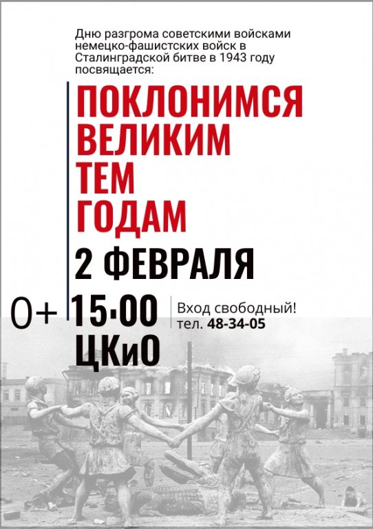| 2 февраля в Центре культуры и отдыха города Иванова состоится мероприятие "Поклонимся великим тем годам", посвященное Дню разгрома советскими войсками немецко-фашистских войск в Сталинградской битве в 1943 году.