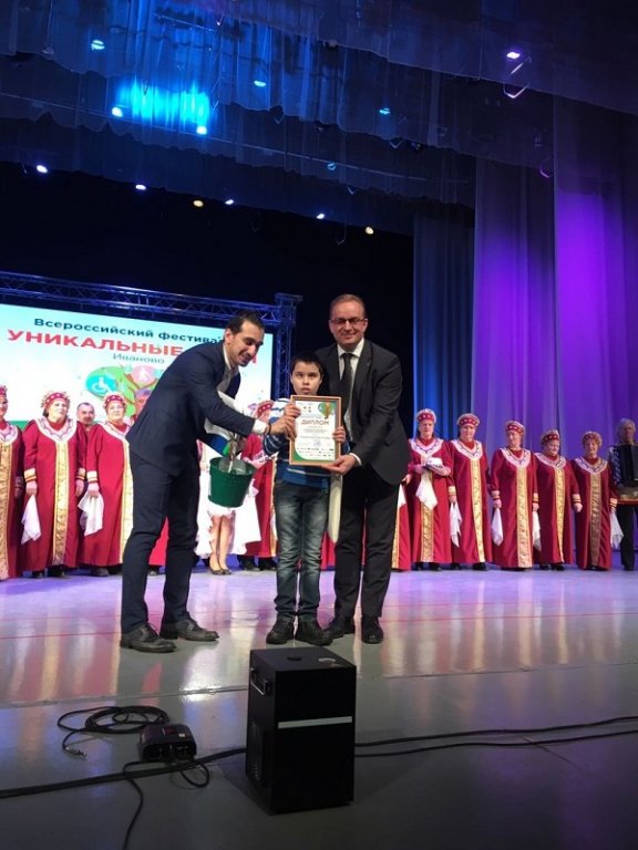 | В городе Иваново на базе ЦКИО «Ивтекс» прошел Фестиваль «Уникальные люди», который в этом году получил статус всероссийского. Фестиваль объединил ребят из Москвы, Санкт-Петербурга, Иванова, Челябинска, Ярославля, Владимира, Рязани и многих других городов. Программа фестиваля была разнообразной: конкурсные этапы, художественная мастерская, ярмарка «Просто искусство», мастер-классы различных направлений, круглый стол, консультации специалистов и зажигательная дискотека. Среди участников фестиваля – учащиеся эстрадно-вокальной студии «Радуга» Екатерина Разумова и Тимур Тетеревятников. На церемонии |