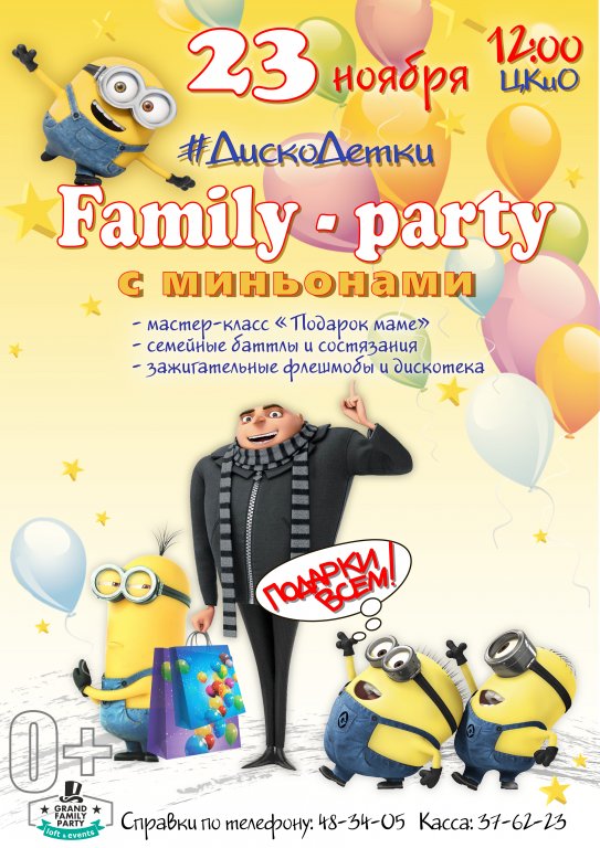 Кто, как не дружная СЕМЕЙКА МИНЬОНОВ, знает толк в зажигательных семейных вечеринках! ![]() ![]() Мимимишные, забавные и очень жизнерадостные существа устроят УЛЁТНУЮ ДИСКОТЕКУ с семейными конкурсами и флешмобами! Без подарков не останется никто! ![]() Давайте вместе поможем Грю поверить в #ПРАЗДНИК и #ЛЮБОВЬ и докажем, что #СЕМЬЯ – это круто! ![]() ![]() ![]() Пока Вы читаете этот пост, МИНЬОНЫ уже готовят для Вас: мастер-класс «Подарок маме»; семейные баттлы и состязания; зажигательные флешмобы и дискотеку; яркую фотозону; ПОДАРКИ ВСЕМ-ВСЕМ-ВСЕМ! ![]() ![]() ![]() ЗАДАНИЕ ОТ МИНЬОНОВ: принеси на вечеринку своё семейное фото, вместе мы устроим нечто грандиозное! ![]() ![]() ![]() ![]() ![]() ![]() ![]() ![]() ![]() ![]() ![]() ![]() ![]() ![]() ![]() ![]() ![]() ![]() ![]() ![]() ![]() P.S. ЖЁЛТЫЙ ЦВЕТ в одежде приветствуется! ![]() ![]() ![]() ![]() ![]() ![]() ![]() ![]() ![]() ![]() ![]() ![]() ![]() ![]() ![]() ![]() ![]() ![]() ![]() ![]() ЦКИО / 23 НОЯБРЯ 12:00 / FAMILY-PARTY С МИНЬОНАМИ Стоимость билета: 250 рублей. Билет приобретается только на ребенка, один сопровождающий взрослый проходит бесплатно. Справки по телефону: 48-34-05 Касса: 37-62-23 |