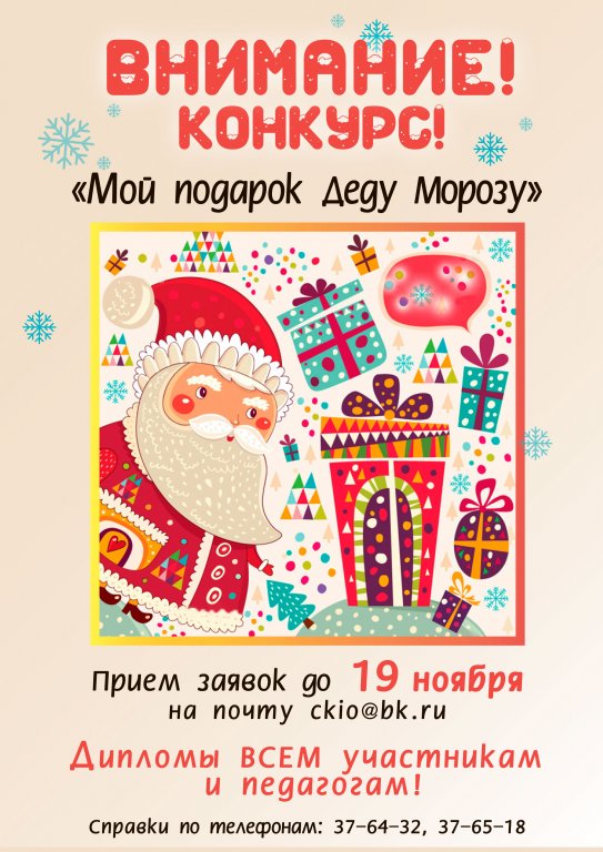 Стартовал прием заявок на ежегодный городской конкурс «Мой подарок Деду Морозу». Номинации конкурса: - рисунки; - поделки; - новогодние открытки; - игрушки на ёлку. ДИПЛОМЫ ВСЕМ УЧАСТНИКАМ И ПЕДАГОГАМ! Прием заявок до 19 ноября! (по установленной форме) Подробнее на сайте ckio37.ru Справки по телефонам: 37-64-32, 37-65-18 |