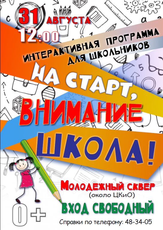 Приготовились...На старт, внимание - школа!![]() 31 августа - это еще каникулы! А значит, это самое время зажигать! В 12:00 в Молодежном сквере - зажигательная интерактивная программа "На старт, внимание - школа". Подготовимся к классным урокам и настроимся на веселые перемены! Веселитесь, играйте, пойте, танцуйте с нами, зарабатывайте "лайки" и обменивайте их на классные, полезные призы!![]() Ждем вас! Место: Молодежный сквер (пр., Ленина,114) Время: 12:00 ВХОД СВОБОДНЫЙ тел.48-34-05 |