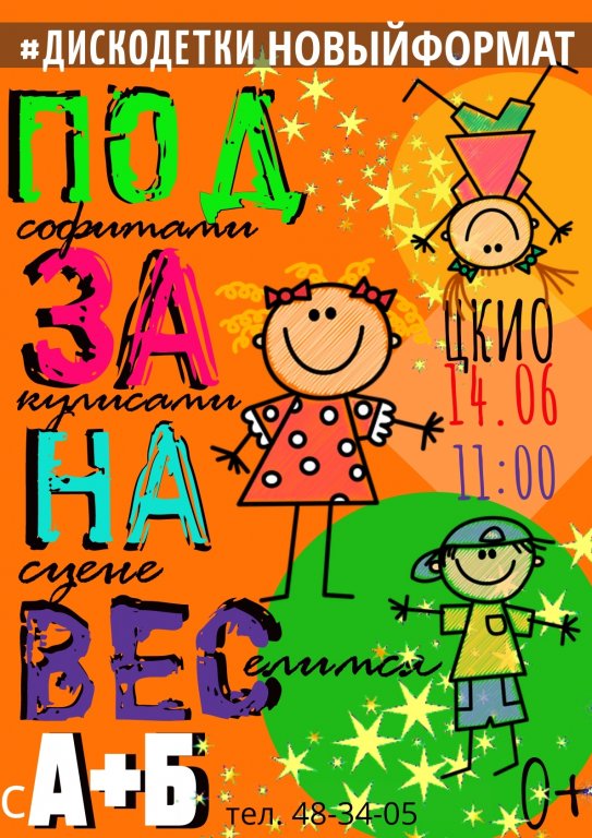 | 14 июня в 11:00 зрительный зал ПЕРЕВЕРНЕТСЯ! И ты окажешься за кулисами! Это будет шоу НОВОГО ФОРМАТА! ДИСКОТЕКА НА БОЛЬШОЙ СЦЕНЕ ЦКиО! ПОД софитами ЗА кулисами НА сцене ВЕСелимся с А+Б! Место: Большая сцена ЦКиО Время: 14 июня 11:00 Заказ билетов: по телефону 48-34-05 |
