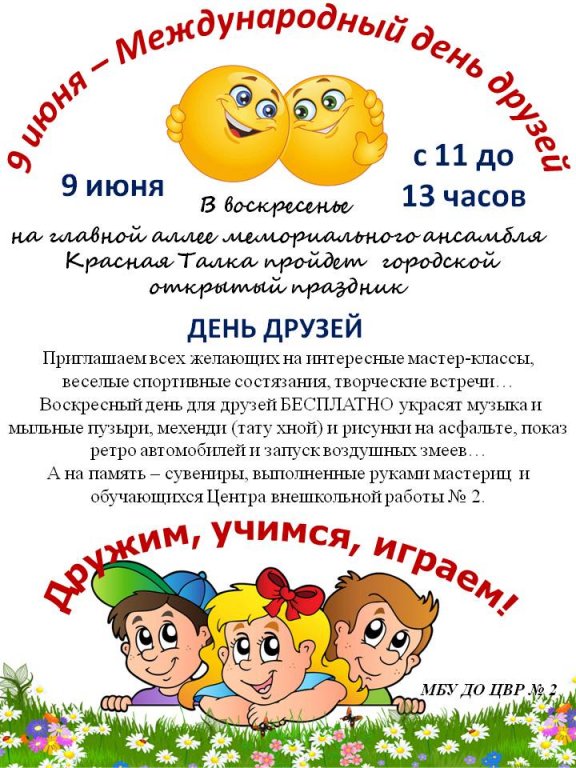 9 июня, в Международный день друзей ЦВР № 2 собрал жителей города на большой праздник. Он прошел на мемориальном комплексе «Красная Талка». Подробнее... |