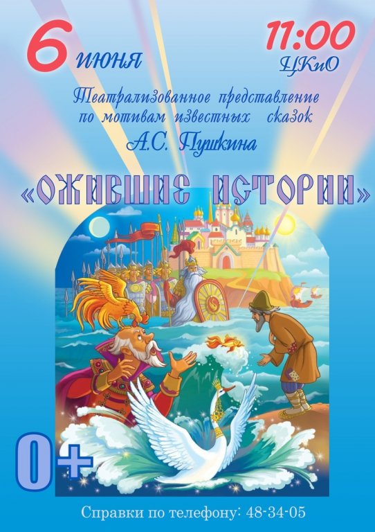 6 июня в 11 часов в Центре культуры и отдыха г. Иванова состоится театрализованное представление «Ожившие истории» по мотивам известных сказок Александра Сергеевича Пушкина. Герои сказок «О золотом петушке», «О царе Салтане», «О попе и работнике его Балде», «О рыбаке и рыбке» оживут на сцене ЦКиО и ты, дорогой зритель, станешь их героем! Как всегда представление будет насыщенно интерактивными играми, песнями, танцами , радостью и весельем! Заказ билетов по телефону: 48-34-05 |