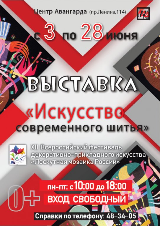 | 3 июня в Центре авангарда состоялось открытие выставки "Искусство современного шитья". Настоящие произведения искусства из тканей и нитей разместились на втором этаже "Центра Авангарда". Отдельная экспозиция посвящена 25-летию клуба лоскутного шитья "Русский стиль". За эти годы коллектив создал множество работ, завоевавших десятки высочайших наград российских конкурсов и фестивалей. Умельцы представили экспонаты в традиционном стиле "Из бабушкиного сундука", а также смогли показать, что техника лоскутного шитья прекрасно подходит для выражения самых смелых и неожиданных идей: от галереи кошачьих характеров до сюжетов аниме и текстильных репродукций авангардных работ В.Кандинского. Все это вы можете увидеть совершенно бесплатно В ЦЕНТРЕ АВАНГАРДА! ПН-ПТ: С 10:00 ДО 18:00 ВХОД СВОБОДНЫЙ! ВНИМАНИЕ! ВХОД НА ВЫСТАВКУ СО СТОРОНЫ МОЛОДЕЖНОГО СКВЕРА (ЗА АРТ-ТРОЛЛЕЙБУСОМ) Автор фото: Андрей Егоров