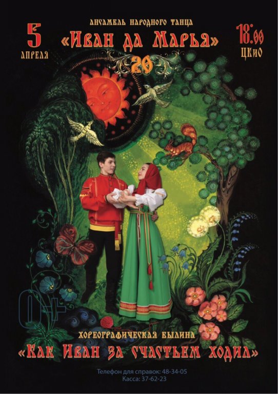 5 апреля в 18:00 в ЦКиО - юбилейный концерт ансамбля народного танца "Иван да Марья" , хореографическая былина «Как Иван за счастьем ходил».