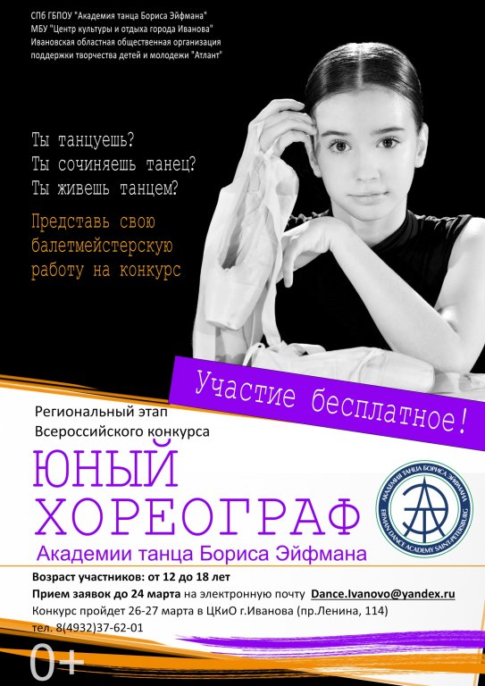 | Воспитать новую творческую элиту России – высокая миссия Академии танца! © Борис Эйфман 26 и 27 марта впервые в Иванове состоится региональный тур Всероссийского конкурса «Юный хореограф» Академии танца Бориса Эйфмана (г. Санкт-Петербург) К участию приглашаются воспитанники хореографических коллективов города, юные танцоры, стремящиеся не просто танцевать, а создавать танец. Соревнование пройдет в двух возрастных категориях: младшая возрастная группа (12-15 лет), старшая возрастная группа (16-18 лет). Чтобы принять участие в конкурсе, необходимо до 24 марта прислать заявку на электронную почту Dance.Ivanovo@yandex.ru с темой письма «Юный хореограф». Региональный этап конкурса пройдет 26 и 27 марта в очной форме на Малой сцене Центра культуры и отдыха г.Иванова (пр. Ленина,114). На конкурс участники представляют одну работу - свою хореографическую постановку в направлении современная или классическая хореография. Подробнее... |