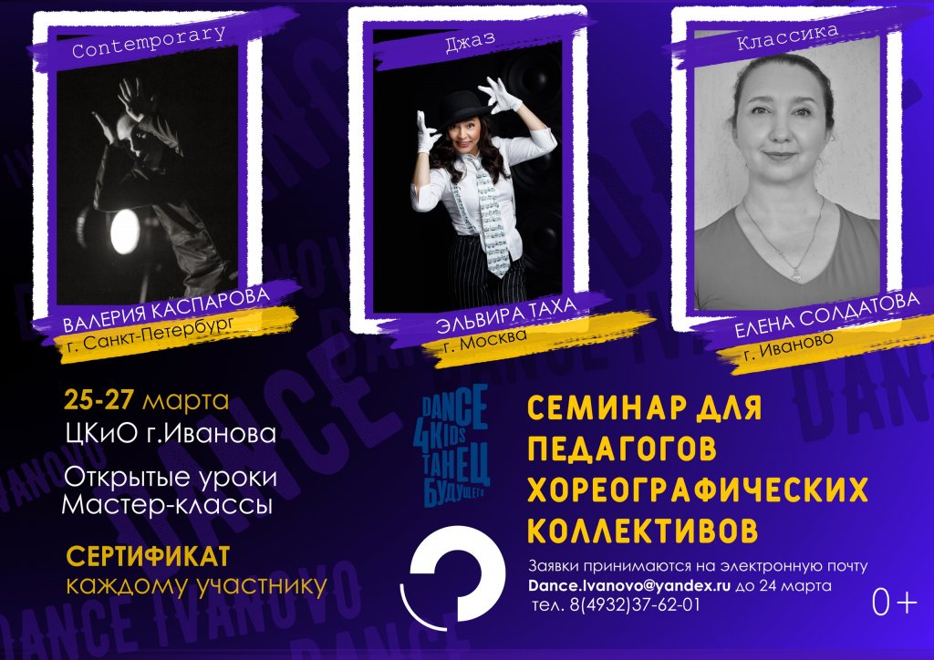 | С 25 по 27 марта в Центре культуры и отдыха г. Иванова впервые пройдет семинар для преподавателей хореографических коллективов. Педагогов хореографических коллективов ждут мастер-классы известных хореографов, открытые уроки по технике джазового танца, contemporary dance, а также по классическому танцу. Партнеры проекта: Санкт-Петербургский Международный фестиваль современного танца Dance4Kids 2021 DANCE 4 KIDS | ФЕСТИВАЛЬ СОВРЕМЕННОГО ТАНЦА, Международный фестиваль современного танца Open Look OPEN LOOK Международный фестиваль танца. Подробнее... |