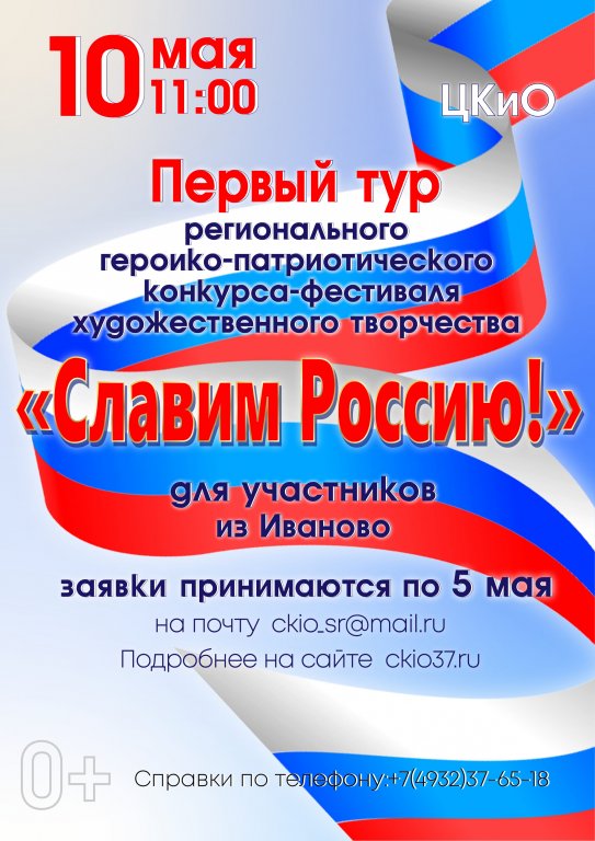 Идёт приём заявок на первый тур Регионального героико-патриотического конкурса-фестиваля художественного творчества «СЛАВИМ РОССИЮ!» для участников из г. ИВАНОВО. Отборочный тур состоится 10 мая в 11 часов в Центре культуры и отдыха. Заявки принимаются на почту ckio_sr@mail.ru по 5 мая включительно.К участию в конкурсе-фестивале приглашаются творческие самодеятельные коллективы: вокальные, хореографические, театральные и художественного слова, в репертуаре которых произведения нравственно-патриотического содержания, прославляющие Россию, боевые и трудовые свершения народов многонационального Российского государства. Возраст участников не ограничен. Категории: Вокал:— солисты-вокалисты; — ансамбли малой формы (дуэты, трио, квартеты); — вокальные ансамбли (от 5 до 16 человек); — хоры (более 16 человек). Хореография:— солисты; — ансамбли малой формы (дуэты, трио, квартеты); — хореографические коллективы. Исполнители художественного слова Театральные коллективы (до 15 человек)Подробнее... |