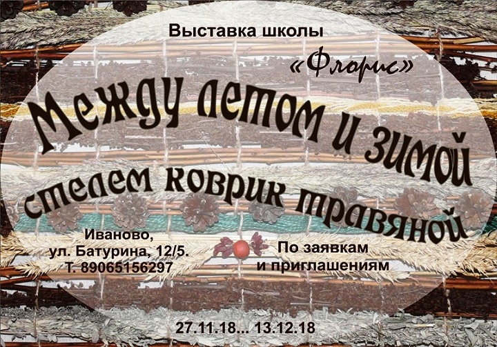 | Школа "Флорис" приглашает всех желающих посетить выставку "Между летом и зимой стелем коврик травяной". Она работает до 13 декабря в здании Дворца творчества, в 39 кабинете. Вход свободный. Время посещения просим согласовывать с педагогами школы "Флорис" по телефону 89065156297. Пятница и суббота - нерабочие дни. |