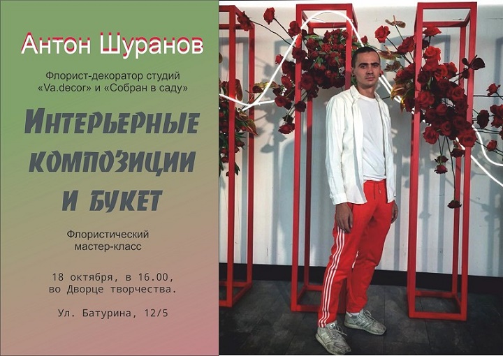 | Приглашаем всех любителей прекрасного присутствовать при рождении удивительных флористических композиций на мастер-классе выпускника школы "Флорис" Антона Шуранова. Флорист-декоратор международного уровня научит правилам создания модных осенних и зимних композиций. |