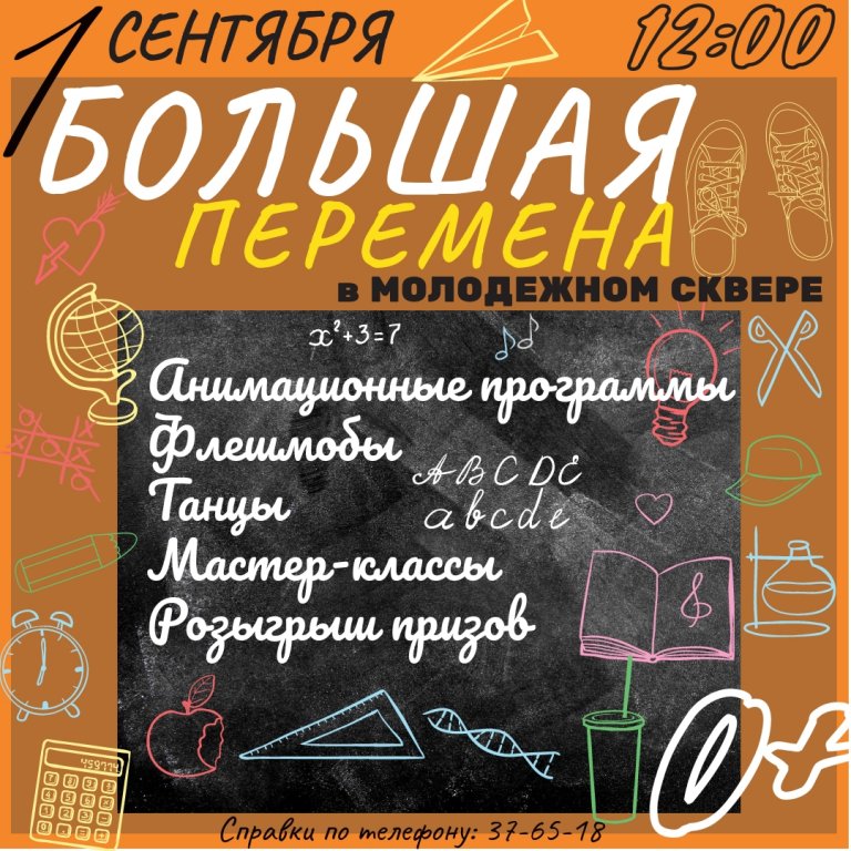 | Что в школе САМОЕ главное? Уроки? Оценки? Каждый ученик скажет, что главное в школе - это переменки! Веселые, энергичные, активные... Как вам идея начать новый учебный год с переменки? 1 сентября в 12:00 в Молодежном сквере - настоящая БОЛЬШАЯ ПЕРЕМЕНА для всех мальчишек, девчонок и их родителей! Гостей праздника ждет невероятная ГАВАЙСКАЯ ВЕЧЕРИНКА, ИГРЫ ВРЕМЕН СССР, анимационные программы, мастер-классы, розыгрыш призов и много-многое другое! Программу проведут финалистки конкурса "Ивановская красавица-2018"! ЖДЕМ ВСЕХ! МОЖНО ПРИХОДИТЬ ВМЕСТЕ С ДРУЗЬЯМИ И ОДНОКЛАССНИКАМИ! ВХОД СВОБОДНЫЙ! Справки по телефону: 37-65-18 #ивановскаякрасавица2018 #ивановскаякрасавица #цкио #иваново#большаяперемена #1сентября #деньзнаний #деньзнанийиваново |