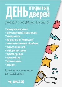 Детско-юношеский центр №1 приглашает на территорию открытий, территорию сотворчества детей и родителей! 26 августа в 12:00 по адресу улица Благова, дом 40а – день открытых дверей! Для Вас – концертная программа коллективов центра, шоу исторической реконструкции, мастер-классы от педагогов декоративно-прикладного творчества. Вы сможете прикоснуться к новинкам: первому российскому 3D конструктору «Фанкластик», приобщитесь к дискуссии на площадке клуба «Терки». Для мам с дочками – площадка нового семейного клуба; для пап – пулевая стрельба! Поиграйте на гитаре в орлятском кругу, отведите малышей на аквагрим, диагностируйте способности ребенка у профессиональных психологов! В одном месте – целый мир для Вашей семьи! |