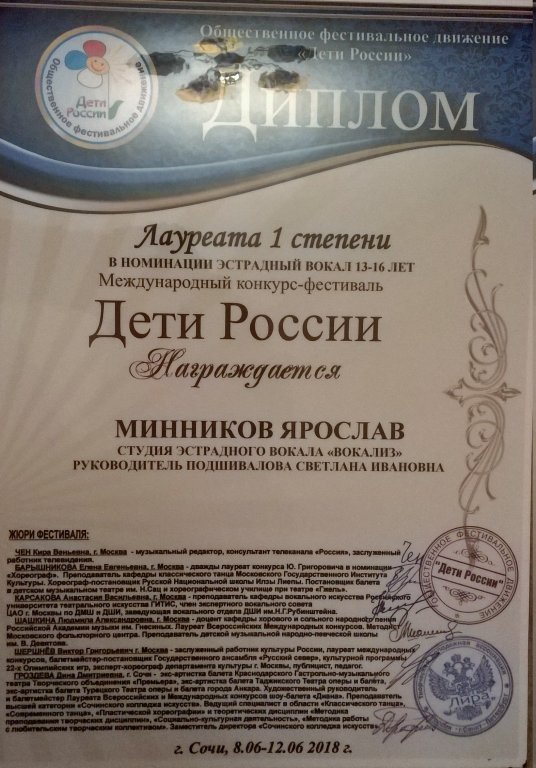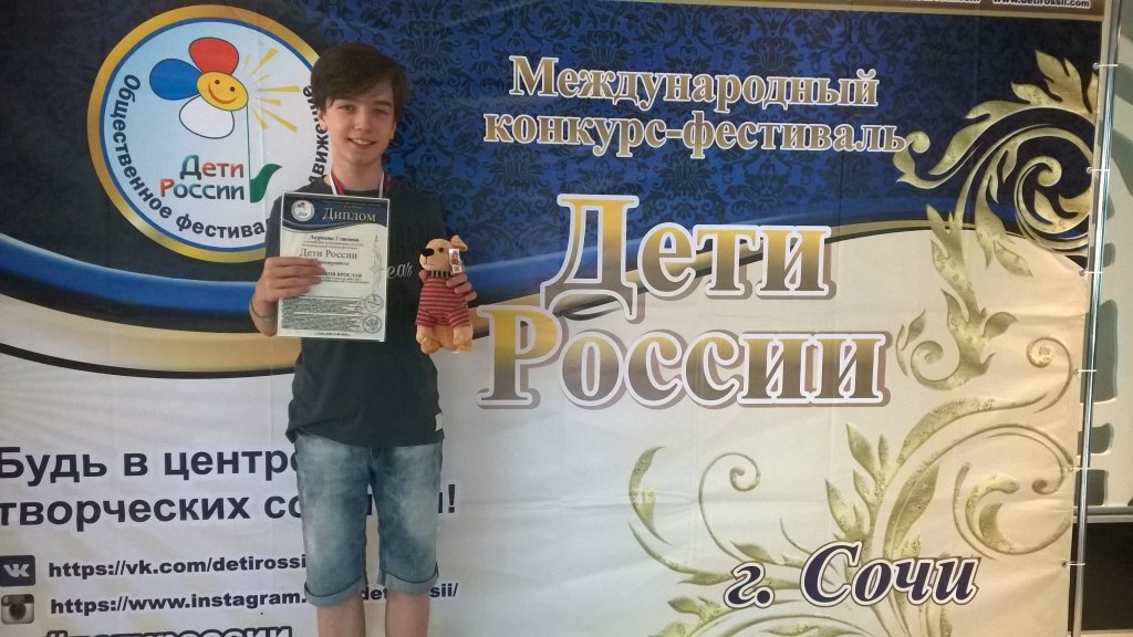 | С 8 по 12 июня в г.Сочи прошел международный конкурс-фестиваль "Дети России". г. Иваново на этом конкурсе представил солист студии эстрадного пения "Вокализ" Ярослав Минников. В номинации "Эстрадный вокал" 13-16 лет Ярослав стал лауреатом 1-й степени. Поздравляем с победой юного вокалиста и его педагога Светлану Ивановну Подшивалову!