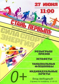 | Проводи лето спортивно! 27 июня в 11:00 в Молодежном сквере (около ЦКиО) спортивно-развлекательная программа "Стань первым" |