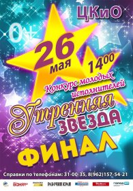 Центр культуры и отдыха встречает финалистов «Утренней звезды» 26 мая на финальном шоу самого звездного конкурса соберутся талантливые танцоры, вокалисты и юные дизайнеры из Иванова и Ивановской области. На сцену выйдут участники, чьи выступления получили высокую оценку жюри в первом, втором и третьем полуфинале, а также победившие в результате зрительского голосования! Ребята на языке танца расскажут о достижениях и победах человечества, 60 лет назад открывшего дорогу в бескрайнее космическое пространство, представят оригинальные танцевальные этюды, приуроченные к празднованию Года театра в России. Со сцены ЦКиО прозвучат песни о Родине и всеми любимые композиции на стихи Ильи Резника, празднующего 80-летний юбилей. Вокалисты старшей возрастной группы представят творческие интерпретации сюжетов известных мюзиклов и рок-опер. Театры моды удивят стильными и неожиданными образами, яркими перевоплощениями. Все это и многое другое в незабываемом финальном шоу конкурса «Утренняя звезда» 26 мая в 14:00 в ЦКиО. Справки по телефону: 31-00-35