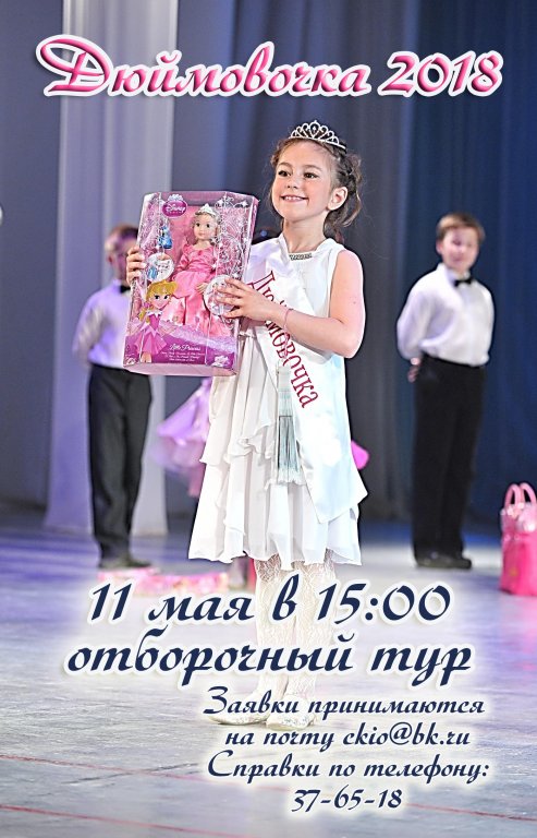 | Центр культуры и отдыха города Иванова приглашает девочек младшего звена (1-4 классы) общеобразовательных школ на городской конкурс "Дюймовочка 2018" Участниц конкурса ждут: Новые знакомства и впечатления! Подарки и сюрпризы! Возможность проявить себя на сцене и раскрыть свой творческий потенциал! Увлекательное путешествие в историю Ивановской области!Заявки принимаются на электронную почту ckio@bk.ru, и в Центре культуры и отдыха г.Иванова (пр.Ленина, 114) каб. №44 Форму заявки и положение конкурса можно найти на сайте ЦКиО http://ckio37.ru/ и в группе ЦКиО ВК https://vk.com/ckio37