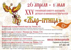 В 2018 году Ивановская «Жар-птица» расправит крылья в 25 раз. За эти годы звание «Столица фестивалей» стало для Иванова почти таким же родным, как «Город невест», ведь именно здесь, с открытием первого Российского конкурса «Жар-птица» началось в нашей стране творческое фестивальное движение, позволившее зажечь сотни тысяч юных звездочек. За эти годы более 25 000 девчонок и мальчишек приняли участие в конкурсе-фестивале «Жар-птица». «От Москвы до самых до окраин…» - такова география Ивановской «Жар-птицы». Все субъекты РФ, более 200 городов направляли талантливых детей в Иваново. Юбилейный 25-ый Российский конкурс-фестиваль детского и юношеского творчества «Жар-птица» пройдет с 26 апреля по 1 мая 2018 года. В 25-ом Юбилейном фестивале «Жар-птица» примут участие творческие коллективы из Москвы и Московской области, Санкт-Петербурга и Ленинградской области, Карелии, Красноярского края, Татарстана, Пермского края, Архангельской области, Владимира, Костромы, Вологды, Ярославля и других городов. Конкурсанты покажут свои таланты в различных номинациях: