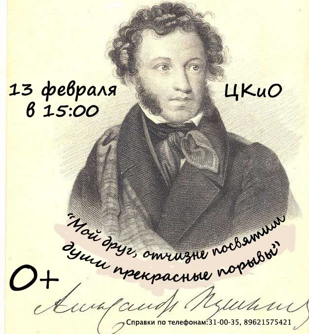| 13 февраля в 15:00 в Большом зале ЦКиО состоится программа "Мой друг, отчизне посвятим души прекрасные порывы" (По творчеству А.С. Пушкина) |