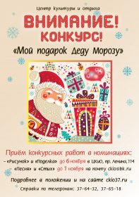 18 ноября - День рождения самого любимого волшебника всех детей - Деда Мороза. ![]() ![]() ![]() Обычно мы пишем ему письма, загадываем свои самые заветные желания и ждём подарки. Но кто подготовит подарок для самого дедушки? САМЫЕ ТВОРЧЕСКИЕ МАЛЫШИ ГОРОДА ИВАНОВО! Именно они поздравят зимнего волшебника и заодно примут участие в IV Городском конкурсе "Мой подарок Деду Морозу" НОМИНАЦИИ КОНКУРСА:- поделка (максимальный размер 50*50*50 см.) - рисунок (А3 или А4) - песня (в видеоформате до 1,5 минут) - стихотворение (в видеоформате до 1,5 минут) Рисунки и поделки принимаются с 26 октября по 6 ноября в ЦКиО (Пр.Ленина, 114) у центрального входа.График приёма работ: 1) понедельник, пятница – с 18:00 до 20:00 2) вторник, среда, четверг – с 12:00 до 15:00 3) в субботу, воскресенье работы не принимаются Подарки в видеоформате (песни, стихи) принимаются на электронную почту ckio@bk.ru с темой письма «Деду Морозу» до 1 ноября. Результаты конкурса будут объявлены в онлайн-программе «С Днём рождения, Дед Мороз!», которая пройдет 18 ноября в 18:00 на интернет-ресурсах ЦКиО. ВАЖНО ![]() Конкурсные работы НЕ ВОЗВРАЩАЮТСЯ участникам! Все подарки остаются Деду Морозу на память! Заявка на каждого участника должна быть оформлена отдельным файлом! От одного участника принимается только ОДНА конкурсная работа! Участие бесплатное. Подробнее в положении конкурса на сайте ckio37.ru Центр культуры и отдыха г. Иванова Адрес: г. Иваново, пр.Ленина, 114 Телефоны для справок: 37-64-32, 37-65-18 |