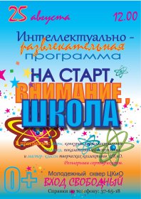 25 августа в 12:00, после перекличек, ждем школьников в Молодежном сквере (около ЦКиО) на интеллектуально-развлекательной программе для школьников «На старт, внимание, школа». Ребят ожидают индивидуальные и групповые зачеты, конкурсы, интеллектуальные поединки, показательные выступления и мастер-классы творческих коллективов ЦКиО.