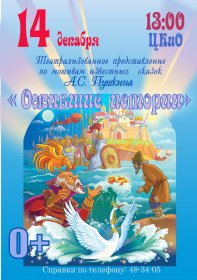 14 декабря в 13 часов в ЦКиО в рамках абонемента для школьников младших классов «Путешествие в мир сказок» состоится театрализованное представление «Ожившие истории» по мотивам известных сказок Александра Сергеевича Пушкина.