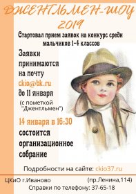 Для участия в конкурсе необходимо прислать заявку на электронную почту ckio@bk.ru с пометкой «Джентльмен». Форма заявки и положение конкурса на сайте http://ckio37.ru/ Заявки принимаются до 11 января. Отборочный тур состоится 14 января в 16.30 в Большом зале МБУ «ЦКиО г. Иванова» Дополнительную информацию можно получить по телефону: 37-65-18 |