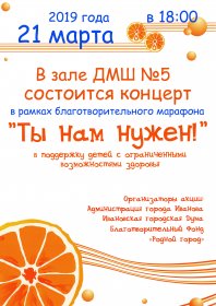 В рамках благотворительного марафона «Ты нам нужен!» пройдёт концерт в нашей школе (зал ДМШ №5 г.Иваново), где юные ученики продемонстрируют свои музыкальные способности в поддержку детей с ограниченными возможностями.