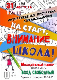 В 12:00 в Молодежном сквере - зажигательная интерактивная программа "На старт, внимание - школа". Подготовимся к классным урокам и настроимся на веселые перемены!