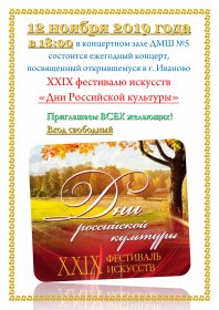 12 ноября 2019 года в 18:00 в концертном зале ДМШ №5 состоится ежегодный концерт, посвященный открывшемуся в г. Иваново XXIX фестивалю искусств «Дни Российской культуры» Приглашаем ВСЕХ желающих! Вход свободный